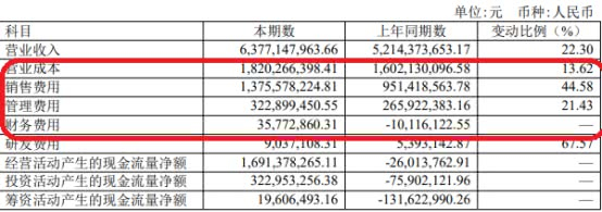 截至2019年上半年末,山西汾酒营业成本18.20亿元,同比增加13.62%,报告称主要原因为材料成本、人工成本增加所致;销售费用13.76亿元,同比增加44.58%,报告称主要原因为加大省外市场规模性拓展、基础市场前置性投入增加、终端拓展投入增加所致;管理费用3.23亿元,同比增加21.43%,系本期工资薪酬、维修费增加所致;财务费用3577.29万元,同比增加4588.90万元,其中利息费用本期7448.95万元,同比增加7347.09万元,利息收入4032.09万元,同比增加2780.14万元,报告称主要原因为本期票据贴现产生的利息支出增加所致。