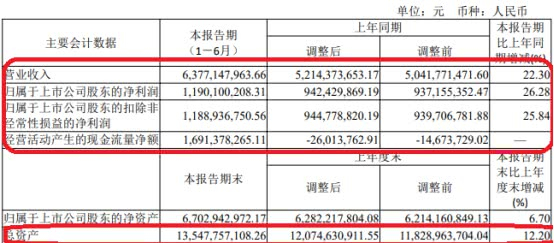 截至2019年上半年末,山西汾酒上半年营收63.77亿元,较去年同期上涨22.30%;归属于上市公司股东的净利润11.90亿元,同比上涨26.28%;归属于上市公司股东的扣除非经常性损益的净利润11.89亿元,同比上涨25.84%;经营活动产生的现金流量净额16.91亿元;总资产135.48亿元,较去年同期上涨12.20%。