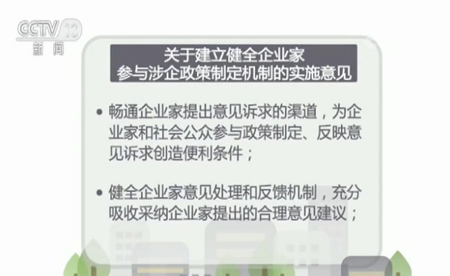 近日,国家发展改革委印发了《关于建立健全企业家参与涉企政策制定机制的实施意见》,包括畅通企业家提出意见诉求的渠道,健全企业家意见处理和反馈机制等。