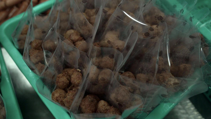 据悉,素香肠与素肉丸沿用了素食食品生产的传统配方,但记者所品尝的素肉丸使用了新的植物肉生产技术:在大豆蛋白块被高速离心机打散的过程中,将香菇茎块打入蛋白质结构中,使大豆蛋白附着在香菇块上,形成丸子。