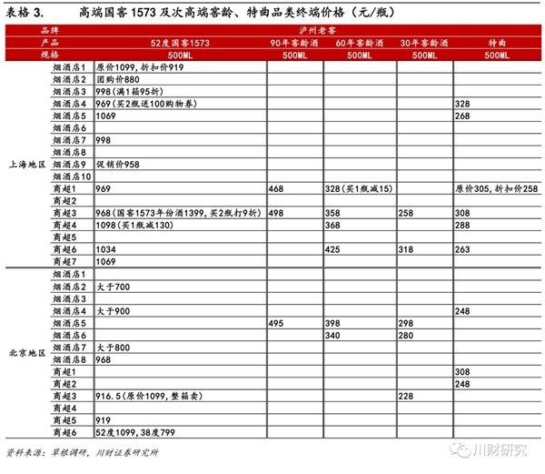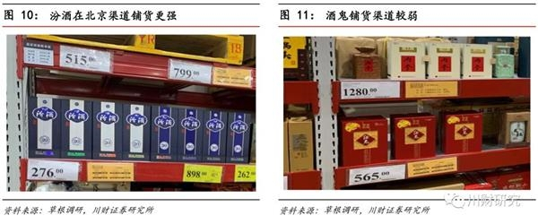 剑南春铺货广,打折促销力度较强;上海为水井坊优势区域,北京为汾酒优势区域;而酒鬼在上海、北京铺货均较弱。