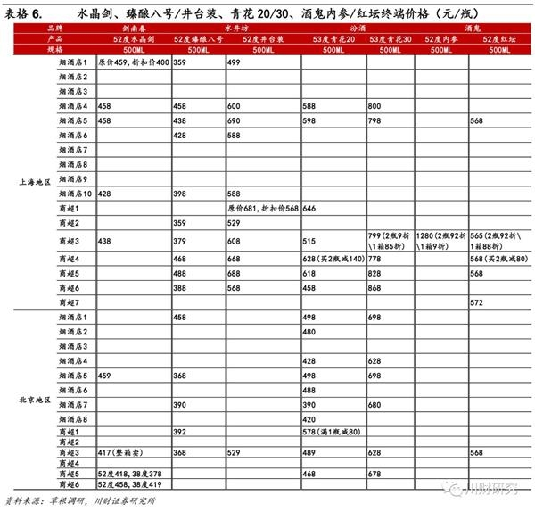 剑南春52度水晶剑铺货较广,标价为458元/瓶,但折扣下来实际成交价多为400-418元/瓶;水井坊在上海铺货更强,其中52度臻酿八号成交价在359-468元/瓶,井台装成交价在529-690元/瓶;而汾酒在北京铺货更强,其中53度青花20成交价在390-498元/瓶,青花30成交价在628-698元/瓶;此外,酒鬼在上海、北京铺货均较弱,其中52度内参标价1280元/瓶,折扣为满2瓶92折、1箱9折,52度红坛成交价在568元/瓶。