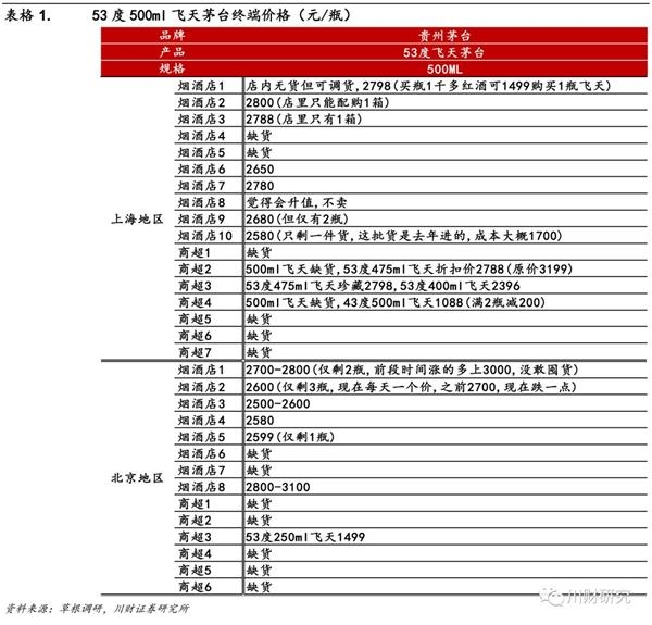 上海、北京两地核心烟酒店仅能配购1箱,其中上海地区烟酒店53度500ml飞天实际价格在2580-2800元/瓶,北京地区烟酒店实际价格在2500-3100元/瓶;此外,上海、北京商超500ml飞天均严重缺货。