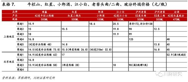 低端白酒主要在商超铺货,品类众多,市场竞争极为激烈。据推销员介绍,牛栏山产品在卖场核心区域强铺货,动销最好;此外,红星二锅头、泸州老窖头曲动销都比较好。从终端价格来看,42度500ml牛栏山陈酿成交价在13.9-16.8元/瓶,高线光瓶酒42度珍品陈酿成交价在48-73.8元/瓶;500ml红星二锅头绿瓶成交价在14.8-17元/瓶,蓝瓶成交价在28元/瓶;小郎酒成交价在18.6元/瓶,江小白成交价在18-20.5元/瓶;泸州老窖52度500ml头曲成交价在98-138元/瓶,52度500ml二曲成交价在12.5-16.8元/瓶;42度红盖玻汾成交价在40-48元/瓶。