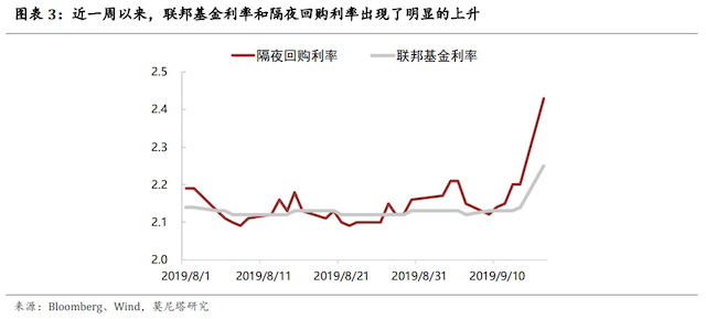 近一周以来,受缴税、国债拍卖等因素的影响,联邦基金利率和隔夜回购利率出现了明显的上升(图表3)。为了应对这一局面,美联储在本周二实行了10年以来的首次隔夜回购操作,规模达到531.5亿美元,用于向一级交易商提供流动性。金融机构之间的短期资金面紧张,推升了联邦基金利率期货,CME FedWatch的计算方法中没有剔除掉这部分影响,这就使得CME FedWatch计算的降息概率偏低。