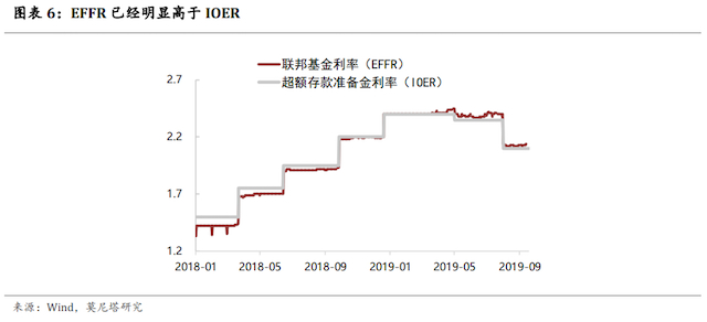 在美国的利率体系中,联邦基金利率(EFFR)代表银行间隔夜拆借利率,超额存款准备金利率(IOER)代表银行在美联储的存款利率。因此理论上,IOER应该是EFFR的下限,因为央行的信用等级更高。但金融危机后,银行的准备金存款暴涨,IOER逐渐成为EFFR的上限,背后的逻辑一是非银机构参与货币市场拆借;二是套利机制受到监管的限制。