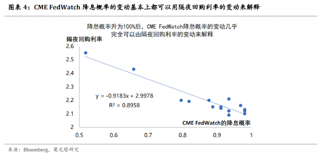 以上的结论可以从历史数据中得到验证。从今年6月份降息概率升到100%后,Bloomberg的降息概率保持在100%附近,CME FedWatch的降息概率一直在变化,但是CME FedWatch降息概率的变动基本上都可以用隔夜回购利率的变动来解释,二者之间的R2高达90%,即:隔夜回购利率越高,联邦基金利率期货就越高,CME FedWatch计算的降息概率就越低(图表4)。