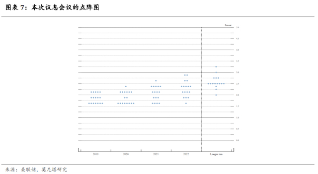 从点阵图上看,10名委员认为2019年不会再降息,只有7名委员认为还将降息一次,2020年预期没有降息(图表7)。本次点阵图的分散程度相较之前明显上升,表明如果经济没有明确的方向性的话,未来美联储内部的分歧可能会继续存在下去。