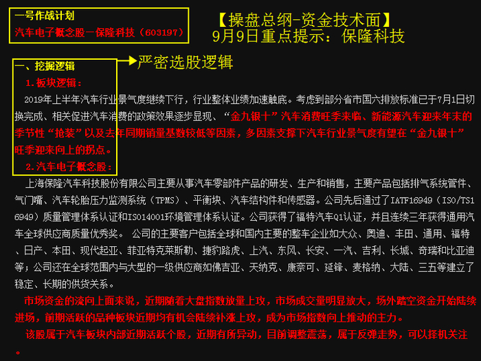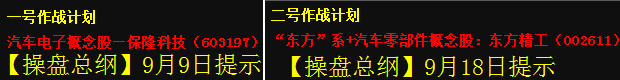 譬如【金融大师-操盘总纲】9月9日、9月18日提示的汽车板块概念股:保隆科技、东方精工,今天纷纷涨停,表现抢眼。