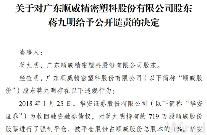 为收回融资融券债权,2018年1月,华安证券对蒋九明持有的719万股顺威股份股票进行了强制平仓。平仓股数为719万股,平仓均价为6.89元/股。但是,蒋九明作为顺威股份的大股东,在明知质押股份将被华安证券强行平仓的情况下,未采取任何措施,且未在上述股份被强行平仓卖出的15个交易日前预先披露减持计划,因此被深交所给予公开谴责的处分。