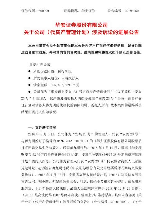 事情要从2016年说起。2016年8月,华安证券作为“华安理财安兴23号定向资产管理计划”的管理人,代表“安兴23号”与蒋九明签订了《华安理财安兴23号定向资产管理合同》以及《华安证券股份有限公司股票质押式回购交易业务协议》。