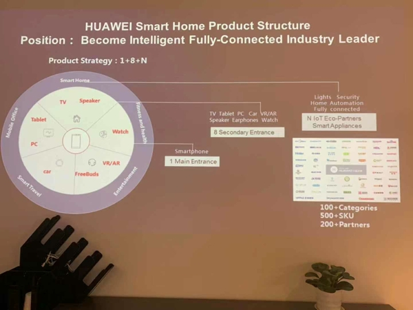第一财经记者在参观华为方舟实验室时留意到,在华为智慧生活的产品生态里,手机是核心入口;彩电、手表、车载、PC、平板等8个产品是第二层入口,也由华为自己做;外围的台灯、家电等入口则通过华为Hi-LinK协议接入合作伙伴的产品,已接入200多个伙伴的100多类、500多款产品。
