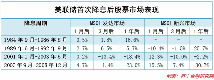 以史为鉴,观察对比美联储4次大规模降息后全球股票市场走势,整体来说,首次降息后3个月内,股票市场整体表现较好,且新兴股票市场要好于发达股票市场。