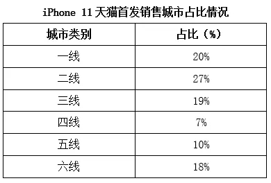 数据显示,iPhone 11 购买用户中,80%是新客(最近一年没有在天猫平台买过苹果手机的用户)。其中,占比最多的是二线城市为27%;四线及以下城市用户占比35%。有意思的是,六线城市买家占比18%直逼三线城市买家占比的19%与一线城市买家占比的20%。