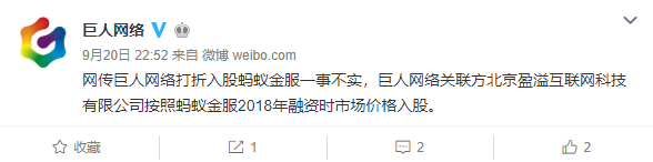 9月20日晚间,巨人网络在官方微博上发文表示,网传巨人网络打折入股蚂蚁金服一事不实,巨人网络关联方北京盈溢互联网科技有限公司按照蚂蚁金服2018年融资时市场价格入股。