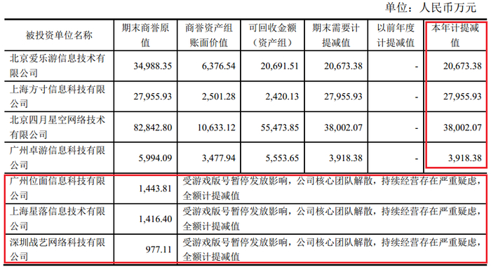 日前,在回复深交所关于年报的问询函时,奥飞娱乐详细说明了相关商誉减值情况,受到游戏版号暂发影响,对爱乐游、上海方寸、四月星空和广州卓游分别计提了2.07亿、2.8亿、3.8亿和3918.39万商誉减值,而广州位面、上海星落和深圳战艺则由于核心团队解散而被全额计提商誉减值。