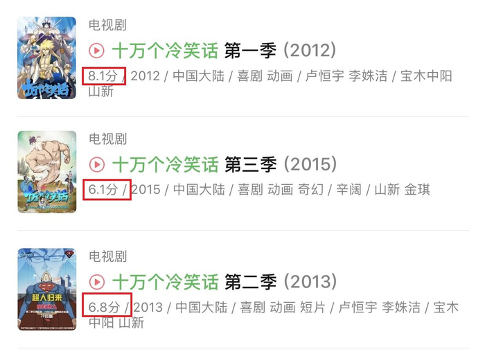 不过,值得注意的是,这些IP续集的推出,非但没有将IP的热度推向更高潮,还导致口碑的不断下滑。“十万个冷笑话”系列动漫的豆瓣评分却从8.1分一路跌至6.1分,而另一主要IP“超级飞侠”虽然降幅微弱,但也隐约有同样的趋势。另外,“镇魂街”和“端脑”改编的影视作品评分也远没有动漫高。
