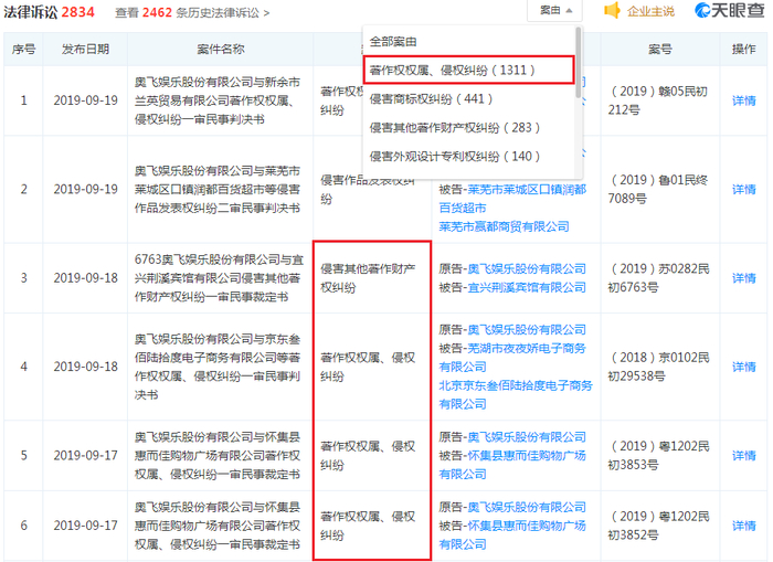 而奥飞娱乐也是深陷其中,据天眼查数据显示,奥飞娱乐共涉及2834件诉讼案件,其中1311件诉讼与“著作权属、侵权纠纷”有关,仅9月就有71条相关诉讼信息,而目前还有15起“侵权纠纷”开庭公告。