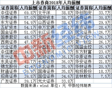 Wind数据显示,2018年券商人均薪酬达到35.05万元,较前一年38.42万元有所缩水,但仍秒杀大部分行业。从2018年年报来看,不同券商之间收入差距也较大,排名第一的中信证券2018年人均薪酬近70万元,而排名靠后的券商如华林证券、中原证券等人均薪酬则刚过20万元。