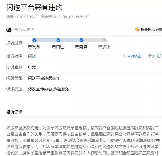以闪送员陈先生为例,投诉内容显示,闪送平台违反约定,对派单闪送员做单量考核,按闪送平台的说法就是闪送员和闪送平台是自由合作的关系,无底薪无提成自由接单,但是现在闪送平台对派单闪送员进行单量考核,周单量必须达到45单,否则就会取消派单资格。