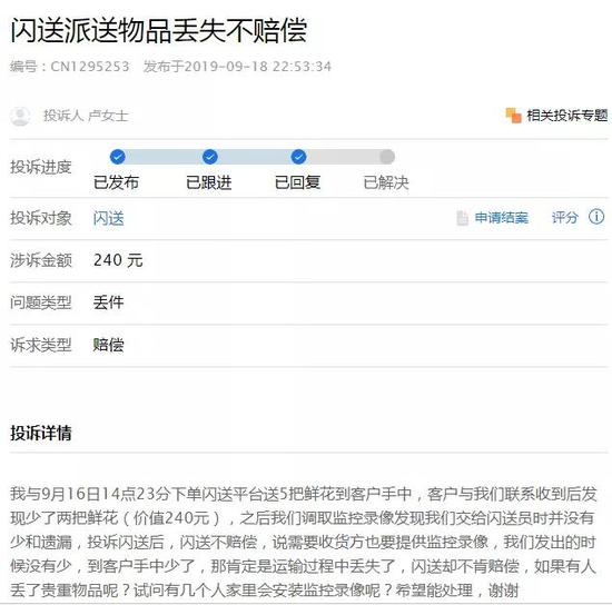 再从消费端看,投诉者卢女士表示,“我与9月16日14点23分下单闪送平台送5把鲜花到客户手中,客户与我们联系收到后发现少了两把鲜花(价值240元),之后我们调取监控录像发现我们交给闪送员时并没有少和遗漏,投诉闪送后,闪送不赔偿,说需要收货方也要提供监控录像,我们发出的时候没有少,到客户手中少了,那肯定是运输过程中丢失了,闪送却不肯赔偿,如果有人丢了贵重物品呢?试问有几个人家里会安装监控录像呢?”