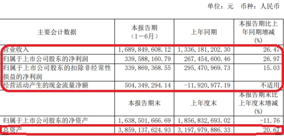 截至2019年上半年末,水井坊上半年营收16.90亿元,较去年同期上涨26.47%,报告称系本期核心产品销量增长,导致收入相应增加;归属于上市公司股东的净利润3.40亿元,同比上涨26.97%;归属于上市公司股东的扣除非经常性损益的净利润3.40亿元,同比上涨15.03%;经营活动产生的现金流量净额5.04亿元;总资产38.59亿元,较去年同期上涨20.67%。