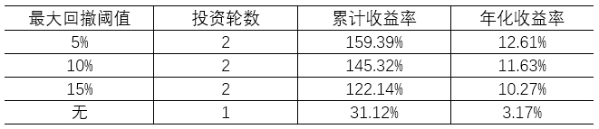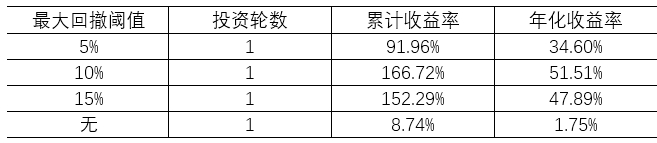 此外,通过对有无最大回撤点的累计收益率进行比较,我们也可以认为:当最大回撤点设置得较为合理时,所获得的收益远多于不设回撤点所带来的收益。
