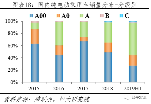 我国新能源乘用车逐渐往大型化、高端化方向转型。根据乘联会数据,2019H1共销售50.7万辆EV乘用车,其中A00、A型车分别销售13.7、26.7万辆,A型车市占率52.7%,已取代A00成为EV乘用车市场主力;2019H1共销售13.7万辆PHEV乘用车,其中A、B、C型车分别销售7.4、4.9、1.4万辆,A型车市占率54.0%,较2017年下降27.5个百分点。EV乘用车往高端车型转变,主要受政策和市场两方面因素驱动: