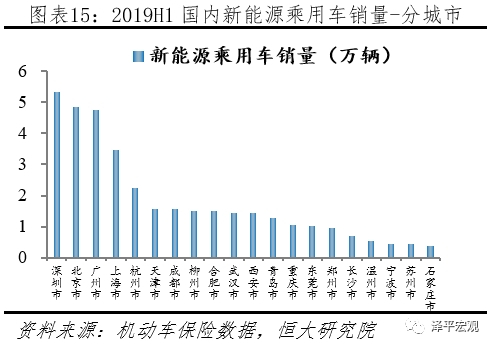 当前新能源乘用车销量主要集中在一二线、限牌城市。2019上半年国内新能源乘用车销量前六名皆是限牌城市,从高到低依次是深圳、北京、广州、上海、杭州、天津,分别销售5.3、4.9、4.7、3.5、2.2、1.6万辆,远高于其他城市。跨区域看,高度集中于东南部沿海省份。从趋势来看,新能源汽车销售逐渐往二三线、非限牌城市渗透。2019上半年我国非限牌地区新能源乘用车销量占比52.1%,自2017年起连续两年多超过限牌地区销量,已成为新能源汽车市场的主阵地。