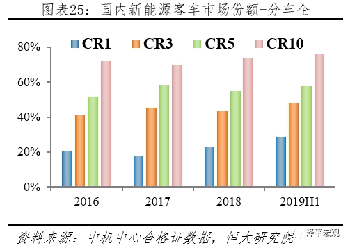 据中机中心合格证数据披露,2019H1商用车市场前十名占据76.0%的市场份额,相比2016年上升4个百分点。新能源客车市场集中度一直在提升,主要是由于存量市场的龙头品牌效应,尤其是龙头宇通客车,份额从2017年的17.6%提升到2019H1的28.6%。此外,部分厂商的市场份额变动较大和地区的替换周期有关,如北汽福田,2017年市场份额5.9%、2018年市场份额2.0%、2019H1市场份10.7%。