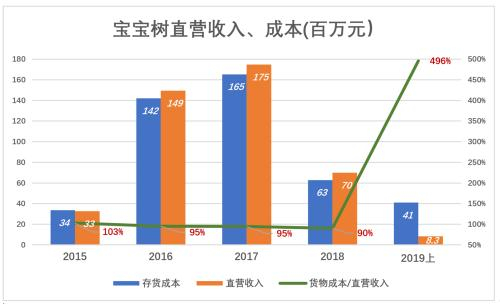 2019年H1,宝宝树直营收入跌到830万元,存货成本4100万元,进货成本高达收入的496%,这是“两折清仓大甩卖”,准备轻装撤退的节奏。