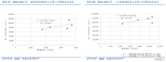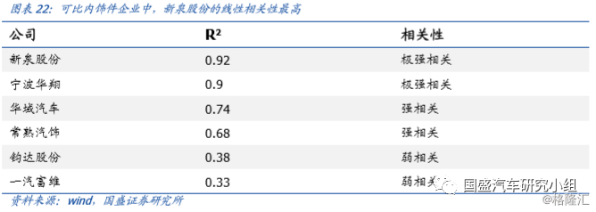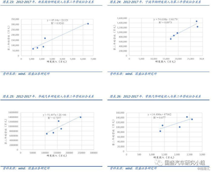 内饰件公司中,新泉股份当年研发投入与次年营收的线性相关性最高,达0.92。考虑到研发投入与最终投产存在1-1.5年的转化时间,因此我们选取当年的研发投入作为自变量,次年的营业收入作为因变量,来探究两者的相关性。我们对比了主要内饰件供应商华域汽车、一汽富维、宁波华翔、常熟汽饰、新泉股份、钧达股份,数据时间维度为2012-2017年,最终发现新泉股份和宁波华翔,当年投入与次年营收之间具有极强的线性相关关系。新泉股份线性拟合R^2=0.92,为内饰件公司第一,宁波华翔仅次于新泉股份(R^2=0.9),随后是华域汽车(R^2=0.74)、常熟汽饰(R^2=0.68),钧达股份(R^2=0.38)、一汽富维(R^2=0.33)。