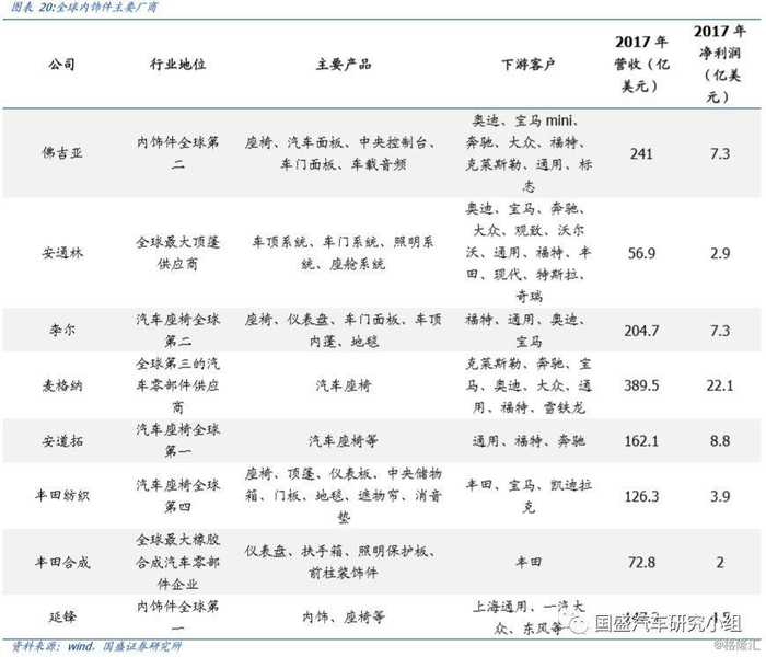 全球主要内饰件巨头有延锋、佛吉亚、麦格纳、安通林、丰田纺织、李尔、丰田纺织等。其营收体量规模都十分客观,2018年全球汽车零部件排行榜上,主要内饰件生产商延锋、丰田纺织、李尔、佛吉亚均位列前20位。