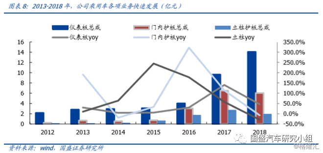 内饰件行业市场空间大,有望孕育零部件巨头企业。内饰件单车价值量高,市场空间大,根据中国汽车工业年鉴统计,2017年我国内外饰件及组件行业实现营业总收入为5683亿元,排名零部件细分行业第一,内饰件行业是培育零部件巨头的沃土。公司主要产品仪表板、门板、立柱护板等单车合计价值可达4000元左右,在内饰件中单车价值量中仅次于座椅,前景空间广大,有望逐步发展为零部件行业巨头。