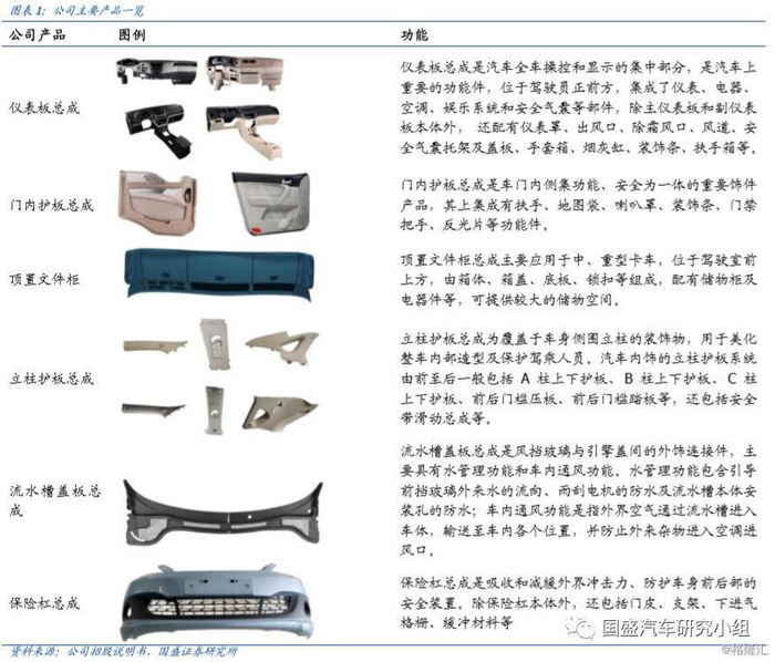 全国百强零部件供应商,主营内饰三大件,为整车厂一级供应商。公司是汽车饰件整体解决方案提供商,连续十二届(2007-2018 年)被中国汽车报社评定为全国百家优秀汽车零部件供应商。目前公司拥有较为完善的汽车饰件产品系列,主要产品包括仪表板总成、顶置文件柜总成、门内护板总成、立柱护板总成、流水槽盖板总成和保险杠总成等,并已实现产品在商用车及乘用车应用领域的全覆盖。