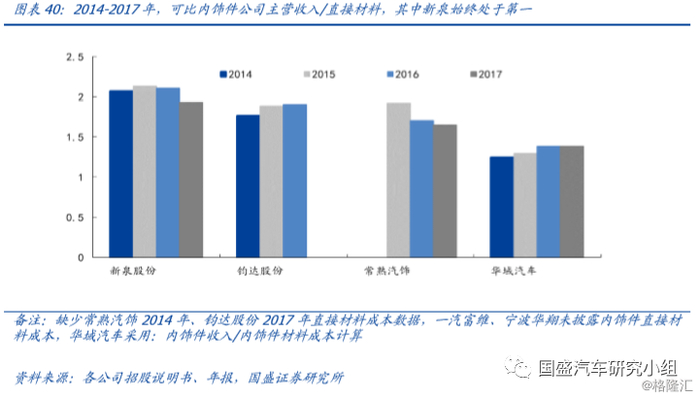 成本控制构成公司护城河优势。公司作为第三方自主内饰件企业,成本控制能力远超行业可比公司。我们采用材料利用率(=主营业务收入/直接材料成本)来衡量公司对成本管控的能力,其中公司14-17年平均材料利用率为2.07,远超其他可比公司(14-17年平均材料利用率为1.61)。