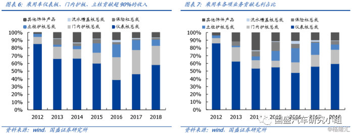 公司乘用车业务持续聚焦,仪表板、门内护板、立柱合计贡献公司乘用车业务90%以上的收入和毛利。仪表板为公司乘用车第一大业务,18年约贡献乘用车58%的收入来源,门内护板、立柱依次为乘用车第二、第三大业务,贡献约24.9%、17.1%的收入来源。