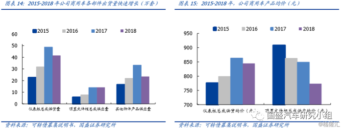 2015-2018年,公司受益于下游重卡行业的高景气度,商用车业务处于快速上量阶段。仪表盘总成由22.65万套提升至41.6万套,CAGR 22.5%;顶置文件柜由5.73万套提升至14.2万套,CAGR35%;其他饰件有16.49万套提升至23.5万套,CAGR 12.5%。