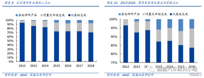 公司商用车客户包含了一汽解放、北汽福田、陕西重汽、东风汽车、中国重汽等国内前五大中、重型卡车企业,苏州金龙等国内大型客车企业。13-18年,公司商用车业务收入复合增速26.65%,其中商用车仪表板收入由1.93亿增长至4.22亿,CAGR 21.59%;顶置文件柜总成收入由0.28亿增长至1.2亿,CAGR 43.8%。