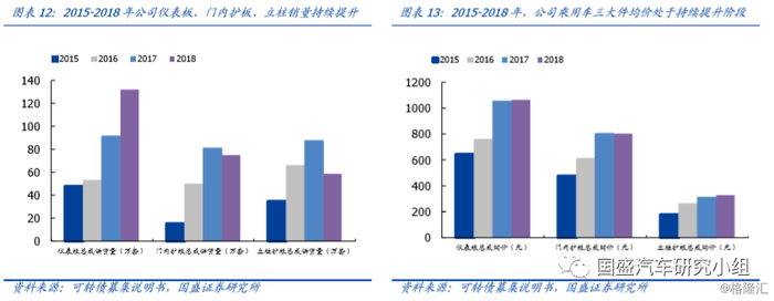 在上量同时,受益于工艺升级,公司产品单价也在快速提升。2015-2018年,公司仪表板总成均价由644.3元提升至1064元;门内护板均价由476.8元提升至803.7元;立柱护板均价由177.86元提升至328.6元。公司产品单价快速提升一方面是因为近年来公司配套客户车型升级,单车售价向上突破带来公司供货产品价格提升;另一方面,近年来内饰件工艺迎来产品升级,由注塑工艺升级为搪塑工艺,带来单品价值量提升。