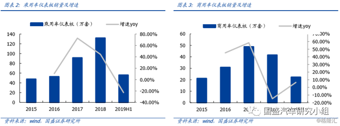量价齐升,市占率快速提升的内饰件新贵。公司是国内自主内饰件领军企业,是吉利、上汽、五大商用车等多家整车企业的一级供应商,连续十二年获得全国百强零部件供应商称号。近几年来公司市占率快速提升,2016-2019H1年公司乘用车仪表板市占率分别为2.2%/3.7%/5.6%/5.5%。受益于工艺升级,公司单价处于上升通道,2015-2018年公司商用车仪表板总成均价CAGR 3%,乘用车仪表板均价CAGR 18.2%。