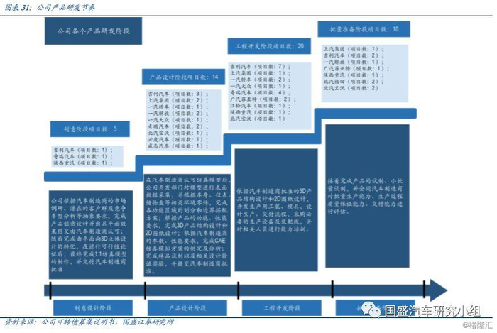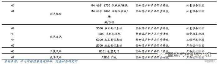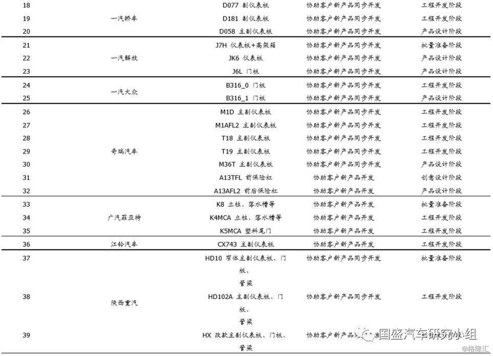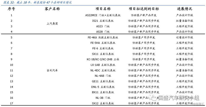 按照客户来分,在研项目中,客户包含了合资与自主,其中合资客户项目有:一汽大众(2个)、广汽菲亚特(3个)等,自主方面主要是吉利汽车(12个)、上汽乘用车(4个)、奇瑞汽车(7个)等。而从产品来看,47个项目中有32个项目为价值量较高的仪表板。