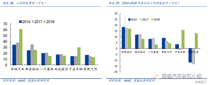 根据可查公告口径计算,2018年公司研发人员对应人均研发费用为25.4万元,仅次于华域汽车。考虑到其中存在人均薪酬额因素,我们计算人工薪酬的方法为: