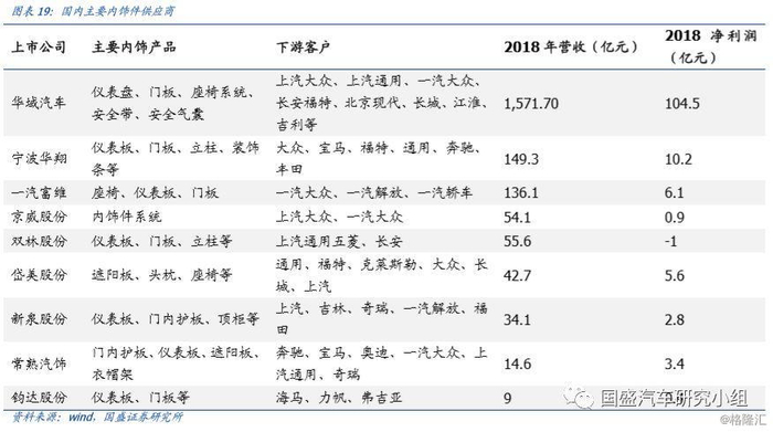 随着内饰件制造工艺的不断进步与行业深度整合,目前国内生产内饰件的主要厂商有华域汽车、宁波华翔、一汽富维、拓普集团、新泉股份、钧达股份、常熟汽饰等等。