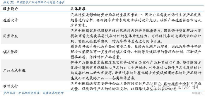 整车企业对内饰件的供应商定位逐步由此前的代工外协转为同步研发。1)早期内饰件供应商的地位类似于整车厂外协件提供商。此前相当长段时间,整车厂重视(设计)外观而非内饰,内饰研发设计投入少,内饰件多为整车厂设计,由内饰件供应商进行外协生产,因此研发设计与制造工程脱节。2)近年来,整车厂对内饰件供应商的要求逐步向整体解决方案提供商转变。