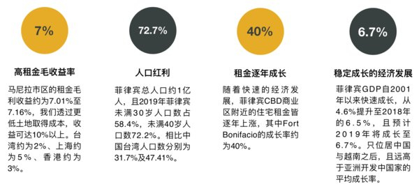 菲律宾一亿人口平均年龄为24岁且劳动力参与率为6成。大量的工作机会增加促使菲律宾年轻人口搬迁至马尼拉大都会求职,加上外商的进驻,在马尼拉大都会如金融重镇Makati或新金融中心BGC的住房和商办需求皆是供不应求。菲律宾过去三年18%的实际工资成长更是进一步深化住房供不应求的状况。在马尼拉大都会就算有钱也不一定能买或租到房,即使市场上有房地产标的释出也会被其他买家用更短时间更高价钱买走,而这样的现象大幅推升马尼拉近几年的房价、地价、和租金收益,精华商业区租金甚至每年成长40%。
