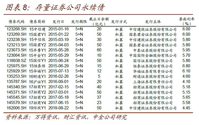 证券公司永续债共16支522亿元存续,均为私募债。截至19年8月末,证券公司永续债存量债共16支,债券余额合计522亿元,期限均为5+N,单支债券规模在5-60亿元不等,票面利率区间为4.1-6.8%。