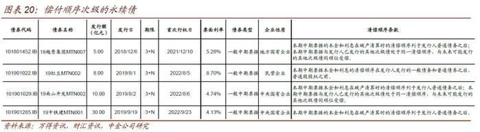 几乎所有一般企业永续债均明确约定在破产清算时的清偿顺序等同于发行人所有其他待偿还的债务融资工具(或负债),也即在破产清偿顺序上并不具有次级属性。截至目前只有4支一般企业永续债在偿付顺序方面明确约定具有次级属性,分别为:广州越秀集团有限公司于18年12月6日发行的18越秀集团MTN007,红豆集团有限公司于19年8月1日发行的19红豆MTN002,中国南山开发(集团)股份有限公司于19年8月2日发行的19南山开发MTN002,以及中国铁道建筑集团有限公司于19年9月19日发行的19中铁建MTN001。4支债券类型均为中票,4家发行人中越秀集团、南山开发和中铁建为国企,红豆为非国企(图表20)。