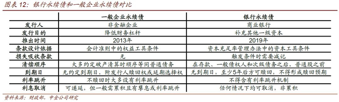 和一般企业永续债相比,银行永续债在发行人、发行目的、推出时间、条款设计依据、损失吸收条款、清偿顺序、到期日、利率跳升、利息取消等方面均存在不同。银行永续债值得重点关注的特殊条款包括:(1)损失吸收条款:当其他一级资本工具触发事件发生时,即发行人核心一级资本充足率降至5.125%(或以下),发行人有权在报银保监会并获同意、但无需获得债券持有人同意的情况下,将届时已发行且存续的银行永续债券按照票面总金额全部或部分减记,促使发行人核心一级资本充足率恢复到5.125%以上。当二级资本工具触发事件发生时,发行人有权在无需获得债券持有人同意的情况下将届时已发行且存续的永续债券按照票面总金额全部减记。其中,二级资本工具触发事件是指以下两种情形的较早发生者:1)银保监会认定若不进行减记,发行人将无法生存;2)相关部门认定若不进行公共部门注资或提供同等效力的支持,发行人将无法生存(PONV)。(2)清偿顺序:清偿顺序在存款人、一般债权人和次级债务之后,股东持有的股份之前。(3)利率跳升:不含利率跳升机制。(4)利息取消:发行人有权部分或全部取消本期债券的派息,且不构成违约事件。采取非累积利息支付方式,即在发行人决议取消部分或全部债券利息的情形下,当期未向债券持有人足额派发利息的差额部分不累积至之后的计息期。