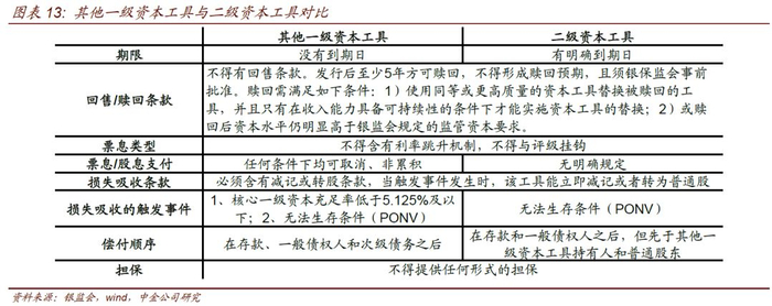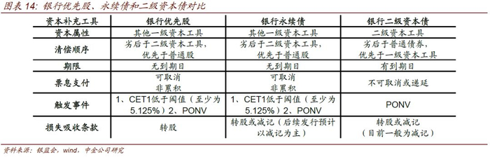 银行永续债和优先股均属其他一级资本工具,相比二级资本工具(目前主要是银行二级资本债),主要区别在于:偿付顺序更靠后,没有明确到期日,任何情况下发行银行都有权取消资本工具的分红或派息,且不构成违约事件等。详细条款对比请见图表13。